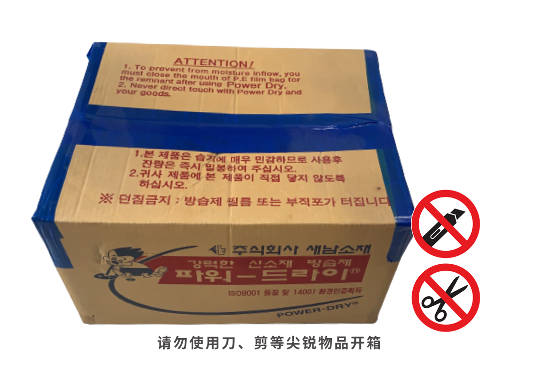 注意:打开干燥剂纸箱时,切勿使用刀、剪刀或尖锐物品,以免切割过深而损坏箱内的干燥剂包。